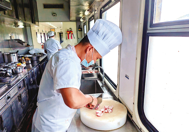 “国庆假期列车上,旅客用餐比平时多很多,但我们要保证菜品的质量,餐料、加工、烹制,每道工序都得用心去做,让乘务员吃得开心,让旅客吃得满意。”李龙腼腆地说。