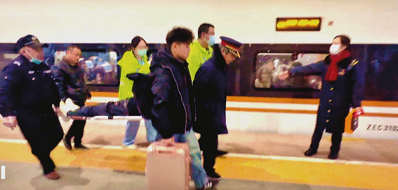 18时,金华站服务台接到G1372次列车长紧急通报:一名旅客在8号车厢中部突发疾病晕厥。金华站立即启动应急预案,第一时间联系金华市急救中心调派救护车。18时09分,列车驶入金华站。此时,车站工作人员、急救医护人员已全部在站台就位。车门开启后,救援人员迅速锁定位于列车中部的患病旅客,合力将其抬下列车。车站开辟绿色通道,仅用时7分钟便将患者安全转移到救护车上。经及时救治,该旅客已脱离生命危险。