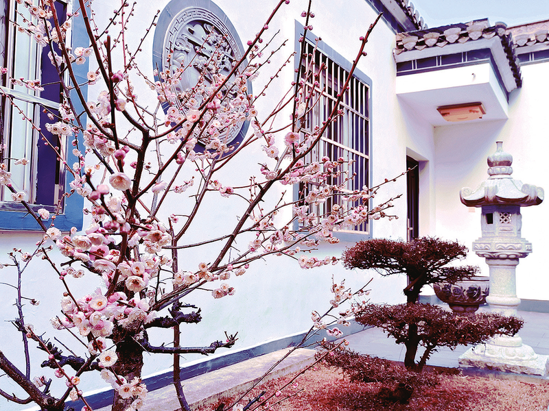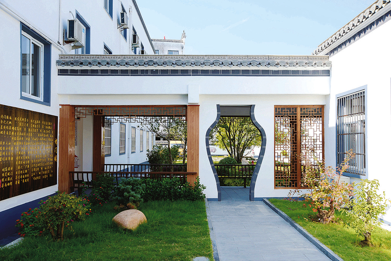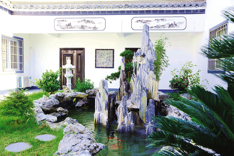 徽派长廊的两侧安设了“美人靠”,如果大家工作累了,就往这一靠,看看书、赏赏景、听听曲,很是惬意。“美人靠”左手边可见花园一角,刻有“乐”字的大石坐落中央,彰显我们家“乐”文化的底蕴。