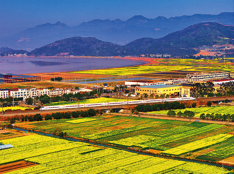 浙江瑞安飞云江畔,列车行驶在杭深线油菜花海中