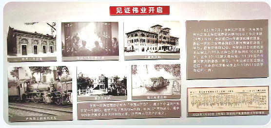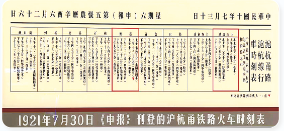 2021年中国共产党百年华诞前夕,上海铁路博物馆新辟“革命烽火”展厅,毛泽东等中共一大代表从北站乘车赴嘉兴是重点展陈内容,中共一大会议场景、1909年落成的上海北站大楼和嘉兴南湖红船照片、1921年《申报》刊登的沪杭甬铁路火车时刻表等图文档案,集中见证了历史伟业的开启,讲述着一大代表用宏大抱负和英勇胆识书写的建党传奇。