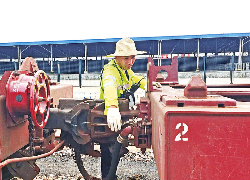 16点05分,一列从到发线牵出的集装箱专用平板车,宛若一条蜿蜒巨龙缓缓“游进”集装箱装卸区集1股道,罗可仔细看了一下胸前的调车作业通知单,待列车停稳后,他快步赶到5236497号集装箱专用平板车前,摘风管、排风、关闭折塞门、拧手闸……一套动作完成得行云流水。在实施车辆提钩作业时,他发现这辆集装箱专用平板车的提钩杆多次提起均纹丝不动。“出现‘咬钩’了。”罗可凭借多年经验即刻判断出症结。