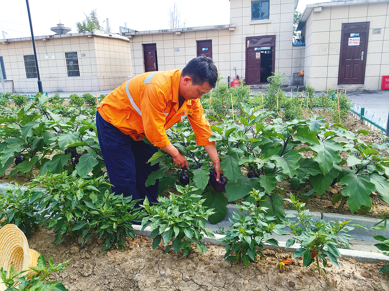 如今,这片菜园成了大伙儿的“新宠”。午休、下班等工余时间,总有人猫着腰在里面除草、捉虫、浇水。昔日的荒地,现在辣椒红艳、茄子油亮、荆芥青翠,一片生机盎然。“以前午休大家伙直接回宿舍睡觉了,现在都爱来菜园转转,看着这些蔬菜一天天长大,心里舒坦,干活都有劲儿!”工长王新亮笑着说。