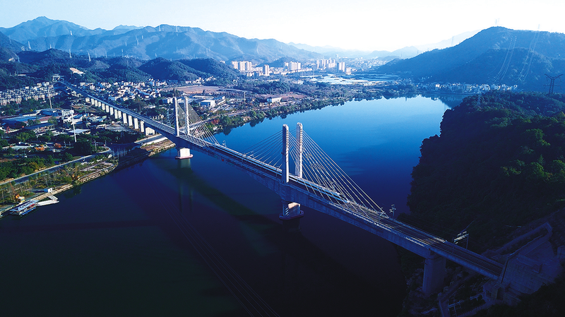 图为试运行列车行驶在新安江大桥上。 (通讯员 王兴 摄) 本报讯(记者 陆应果 通讯员 张子扬)11月20日8时,首趟试运行列车G55611次从建德站开出,沿着新建杭州至衢州高速铁路驶向江山站方向,进行列车运行图参数测试,标志着杭衢高铁建设进入试运行阶段。