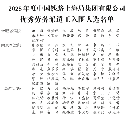 根据《中国铁路上海局集团有限公司关于开展2025年度优秀劳务派遣工评选工作的通知》(上铁劳卫函〔2025〕755号)精神,各相关单位按照评选条件和推荐办法,已完成评选推荐工作,经集团公司审核初评,现予以公示。