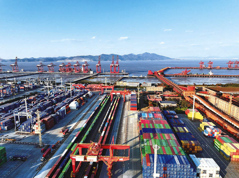 12月3日下午,一列满载义乌小商品货物的海铁联运班列缓缓驶入宁波舟山港铁路北仑港站。至此,该站今年集装箱作业量突破100万标准箱,成为国内首个迈入“百万箱级”的铁路港站。 (通讯员 梁力 摄)