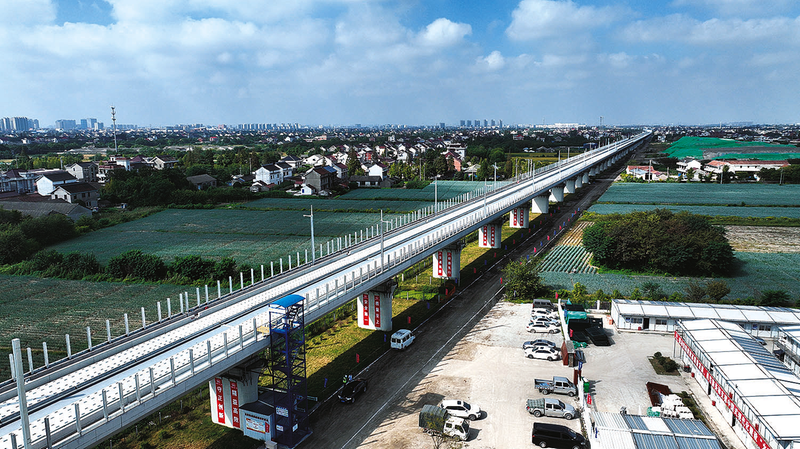沪渝蓉高铁沪宁段站前Ⅶ标位于江苏省南通市海门区与通州区境内,正线全长21.37公里,其中南通特大桥15.5公里,无砟轨道直线段5.927公里,曲线段9.573公里,轨道板共计5726块。该桥采用CRTSⅢ型板式无砟轨道结构设计,施工过程中,项目团队自主研发底座板跨线整平一体机、数智粗铺机、数智精调车、数智混凝土灌注车等智能化工装设备,创新应用限位凹槽模板及定位装置、气泡消除插板、滴灌养生系统等26项小型工装,采用创新施工工艺,着力打造精品示范工程。