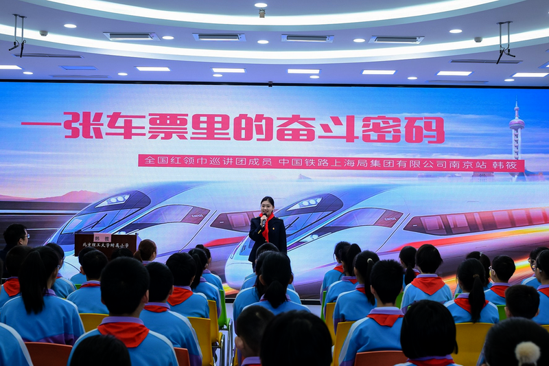 经全国铁道团委推荐,南京站客运员韩筱于今年10月成功入选全国红领巾巡讲团研修班,赴全国青少年井冈山革命传统教育基地,开启为期半个月的沉浸式研修,为宣讲党的二十届四中全会精神蓄力。近日,韩筱以《一张车票里的奋斗密码》开启全国巡讲,紧扣党的二十届四中全会精神,通过“时代楷模”单杏花的创新故事,让“国之大者”看得见、摸得着。图为韩筱在北京理工大学附属小学宣讲。