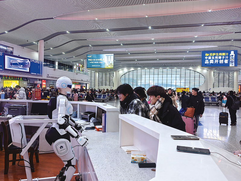 为做好元旦假期运输工作,芜湖车务段推出“智慧服务”,在芜湖站新增两台“墨甲”机器人,分别驻守“皖江明珠”雷锋服务站和“两区一室”候车区,为旅客提供咨询车次、查找候车区、解答出行疑问服务,受到旅客热捧。图为旅客向“墨甲”机器人咨询乘车信息。