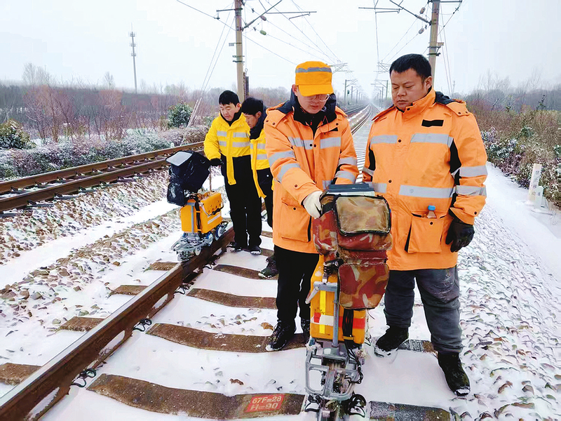 1月20日9时38分,在京沪上行线下蜀站至龙潭站间的线路上,7名南京桥工段探伤车间江南探伤工区的“钢轨医生”正冒着严寒踏雪“出诊”,保障钢轨安全无虞。