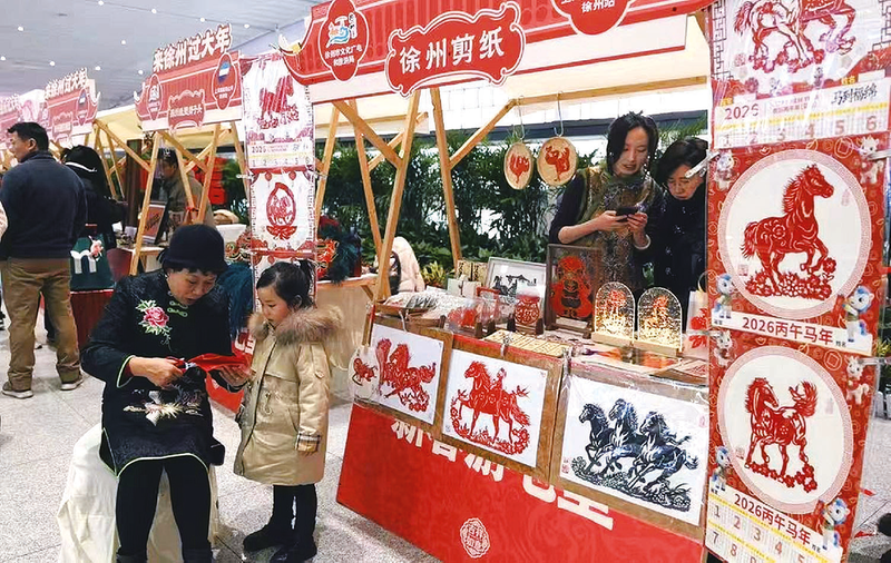 图①:徐州直属站组织人员在徐州东站候车大厅向旅客展示剪纸艺术。 (通讯员 张光磊 摄)