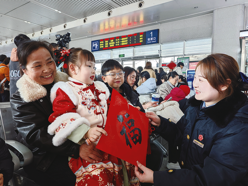 图②:淮北车务段淮北站工作人员向旅客送“福”字。 (通讯员 王春辉 摄)