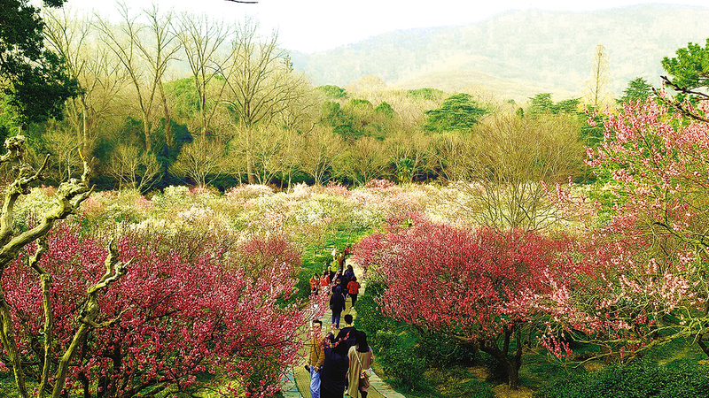 从山顶往下走,有一处地方视野开阔。站在那儿望下去,漫山遍野都是梅花,深深浅浅,像谁把颜料打翻了,又随意地晕开。远处是紫金山,淡淡的一抹青色。天是蓝的,太阳是金的,梅花是粉的、白的——这颜色搭配在一起,怎么看,怎么舒服。有人举着手机在那儿拍照,我也站了一会儿。风过的时候,满山的花枝都动起来,轻轻的声音,不知是风声还是花声。