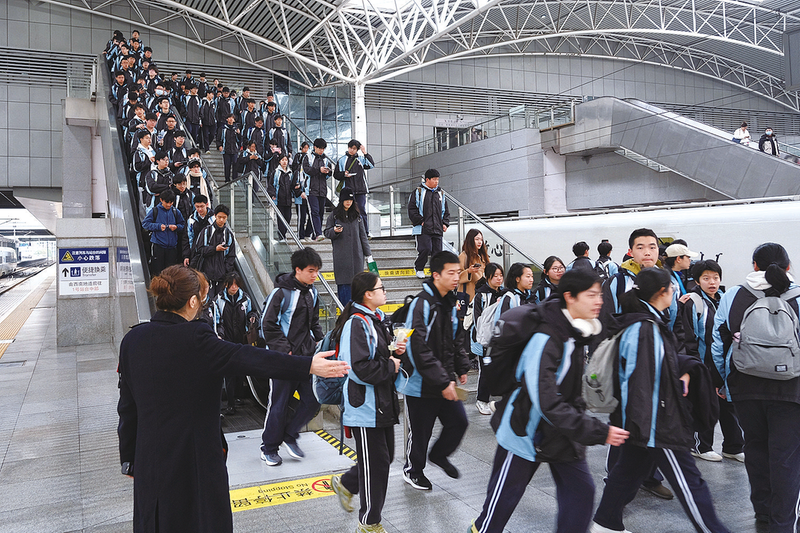 上海站工作人员服务学生研学团体乘坐高铁出行。 (通讯员 过云松 摄) 通讯员 过云松