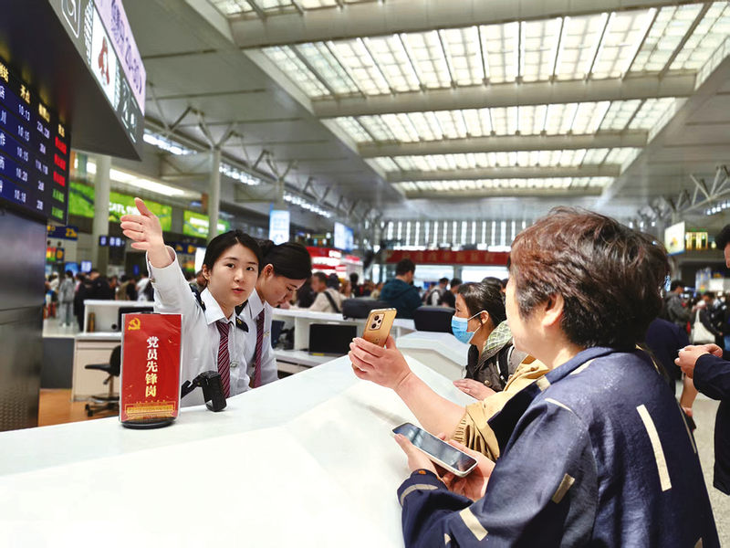 上海虹桥站工作人员解答旅客问询。 (通讯员 陈瑶 摄)