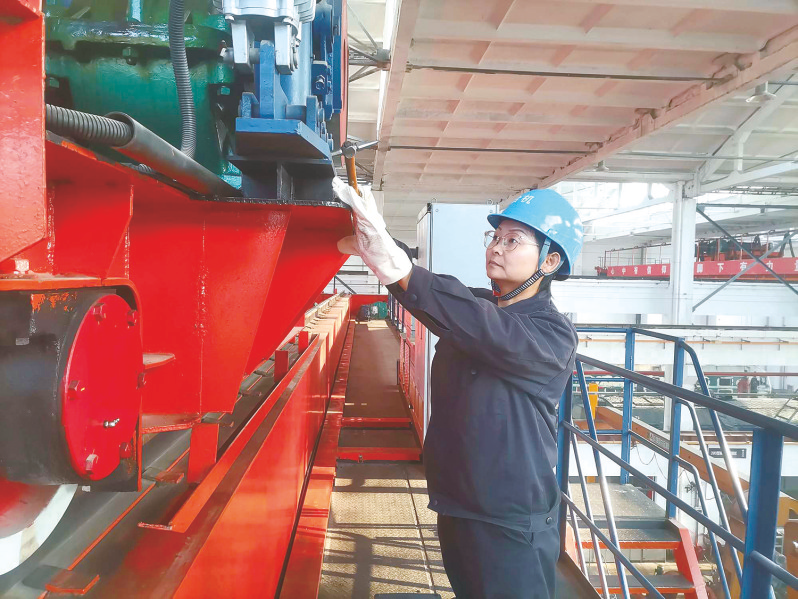 云端上的“舞者” 外人眼中的天车司机,可能是“动动手指、看手势”的轻松活,但在朱忠芳看来,这方寸驾驶室是“荣辱一把闸,安危一念间”的重要场所。除她之外,还有三名从事该岗位的“空姐”。朱忠芳是这支“空姐”团队中的灵魂。每天上班前,她总是第一个抵达岗位,认真检查每一处制动装置。在作业中,她面对的是几十吨重的柴油机和零零散散的配件,需要在“走梅花桩”般的狭窄立柱间穿梭。左手控制大车平稳运行,右手负责吊钩起起落落,脚下还要不断踩铃警示,目光要时刻关注现场的动态。